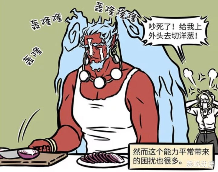 在雷公做饭的时候,一旦切洋葱就会让第三只眼睛流泪,这样一来就会有持续不断的出现震天雷鸣。如果跟雷公住在同一栋楼,那肯定会被吵死。至于电母,跟雷公朝夕相处,也受不了这种设定。所以切洋葱的时候,电母让雷公去外面。